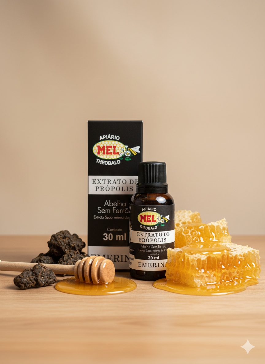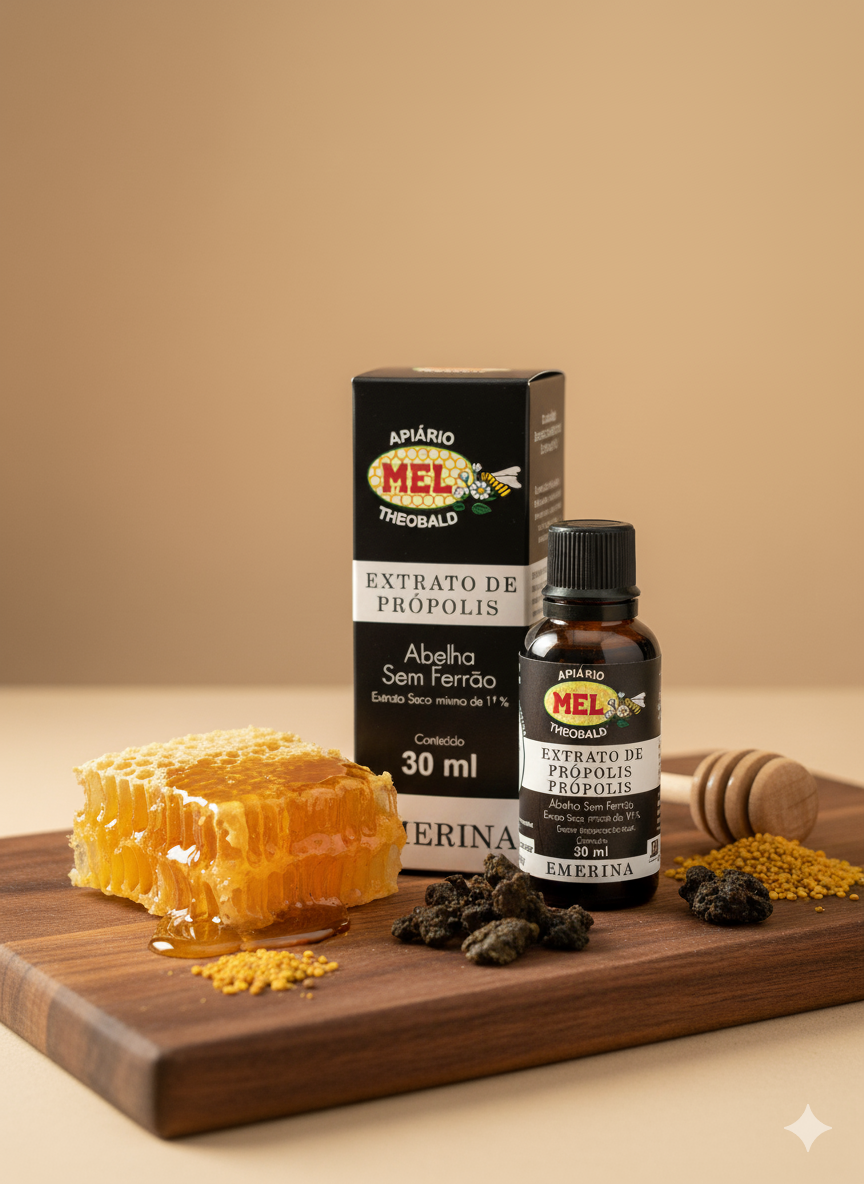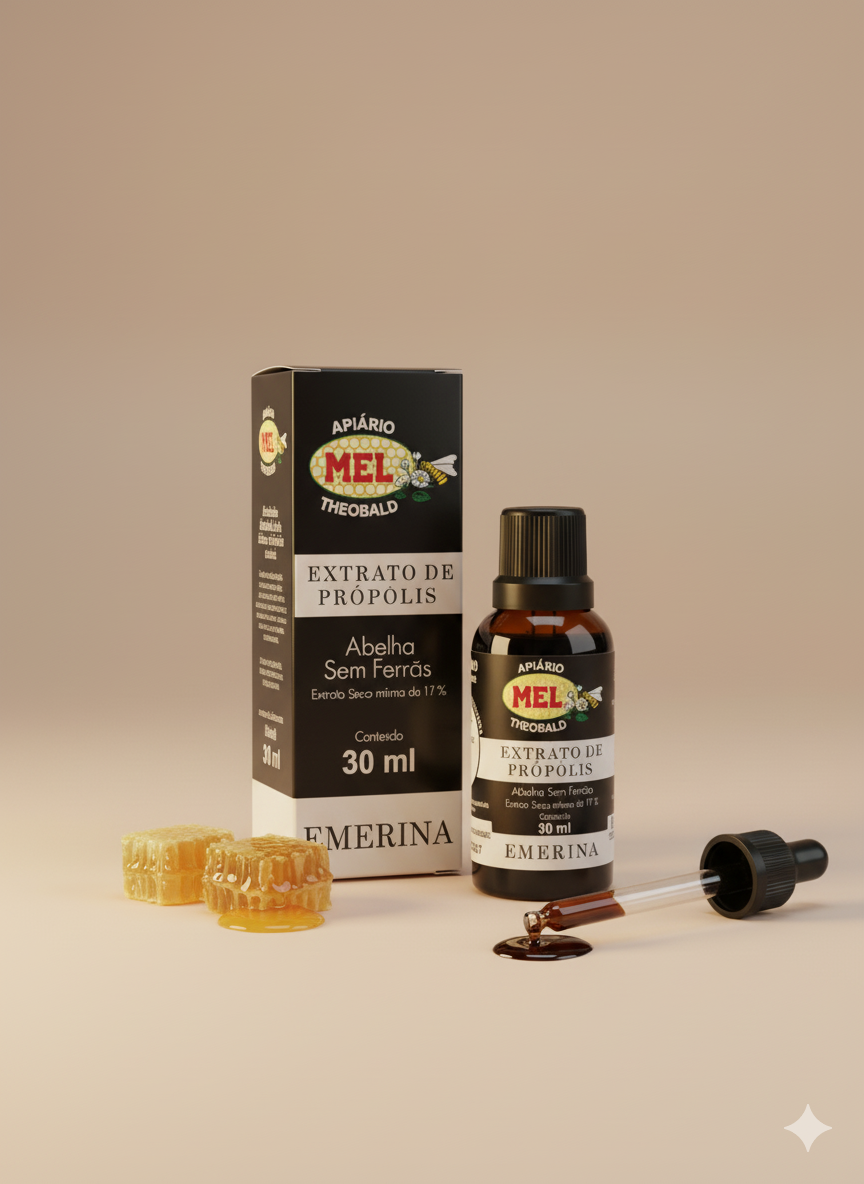 Extrato de própolis de abelha sem ferrão (Melipona), conhecido como Emerina, é um concentrado natural rico em compostos bioativos. Obtido através de processo de extração cuidadoso, preserva flavonoides, fenóis e outros constituintes benéficos. Utilizado tradicionalmente na apiterapia, oferece propriedades antioxidantes e anti-inflamatórias. Ideal para quem busca suplementação natural com origem sustentável, respeitando o bem-estar das abelhas nativas brasileiras.